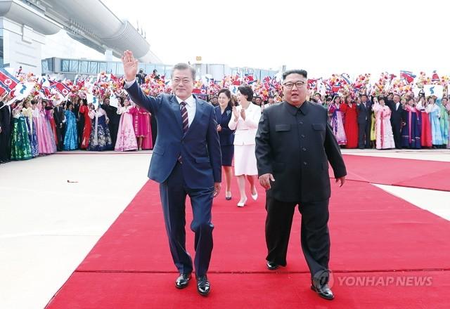 문재인 대통령 내외와 김정은 국무위원장 내외가 18일 오전 평양 순안공항에서 열린 공식 환영식에서 평양 시민들의 환영을 받으며 이동하고 있다.