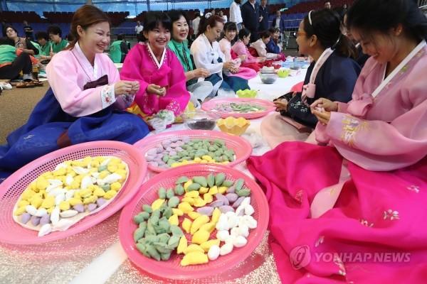 19일 오전 서울 송파구 서울놀이마당에서 열린 '사랑의 송편 빚기'행사에서 다문화 주부, 주민 등이 오색 송편을 빚고 있다. 송파구는 추석을 맞아 행사를 통해 빚은 송편, 반찬 등을 홀몸노인 가정에 전달할 예정이다.