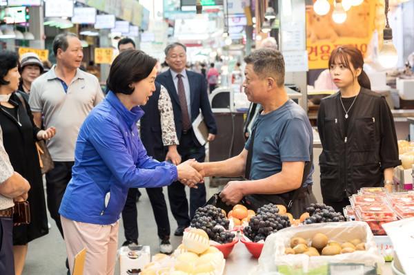 서울 양천구가 추석을 앞두고 구민들이 질 좋은 상품을 저렴하게 구매하고, 전통놀이 및 경품 추첨 등 풍성한 행사도 즐길 수 있도록 경창시장에서 추석 명절 이벤트를 개최했다. 사진은 경창시장을 방문한 김수영 구청장(왼쪽)이 한 상인과 악수를 하며 인사를 나누고 있는 모습. (사진제공=양천구청)