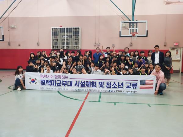 지난 18일 경기 평택대학교 다문화가족센터가 한광여중 1학년 60여명의 학생과 안정리에 있는 미군부대 캠프 험프리스에서 미군장병과의 만남, 중학교 방문 및 교류활동, 유스센터 방문, 한국군 지원단 견학 등의 방문 체험 프로그램을 진행했다. 사진은 프로그램 종료 후 기념촬영을 하고 있는 참가자들의 모습. (사진제공=평택대학교)