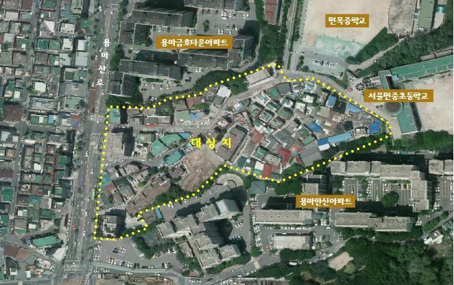 구에 따르면 면목3·8동 1075번지 일대는 대규모 아파트 단지 사이에 둘러싸인 노후된 주거지로서 골목길 상당수가 가파르고 좁아 차량 진입이 불가능해 신축은 물론 집수리도 어려워 20년 이상 된 노후건물이 대다수를 차지하는 지역이다.