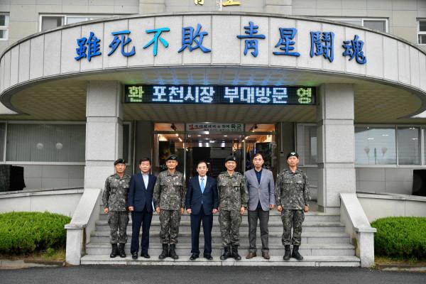 박윤국 경기 포천시장은 최근 추석명절을 맞아 지역내 군부대와 경찰서, 소방서 등 23개 기관을 방문해 국토방위와 치안유지 등에 힘쓰는 군·경·소방 관계자를 격려했다. 사진은 육군 재6사단을 방문한 박 시장 등의 관계자들이 기념촬영을 하는 모습. (사진제공=포천시청)