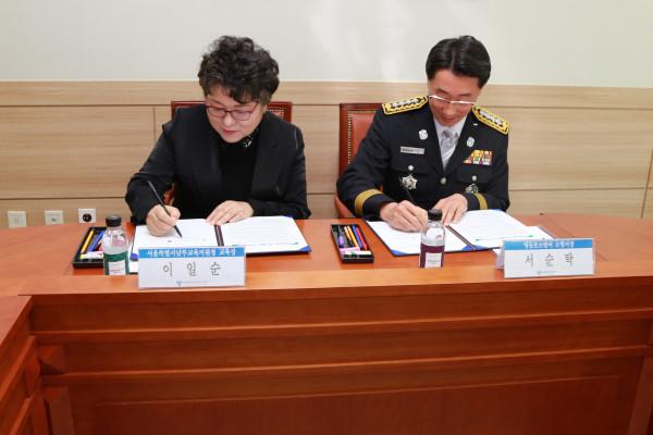 영등포소방서는 27일 남부교육지원청 소회의실에서 소방공무원과 남부교육지원청 양 기관 관계자들이 참석한 가운데 영등포구 학생 및 교직원의 안전교육 및 안전의식 함양을 도모하기 위한 '안전 나눔 119지원단' 업무협약(MOU)을 체결했다. 사진은 서순탁 서장과 이일순 교육장이 협약서에 서명을 하고 있는 모습. (사진제공=영등포소방서)