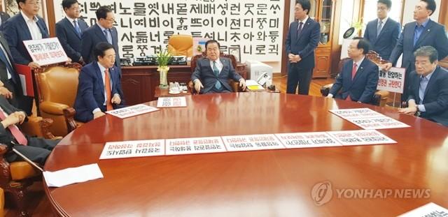 27일 오전 긴급의원총회를 마친 자유한국당 김성태 원내대표 등 의원들이 심재철 의원실 압수수색 등과 관련해 문희상 국회의장을 항의방문하고 있다.