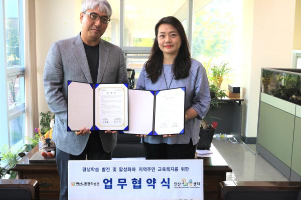 경기 안산시평생학습관과 안산온마음센터가 최근 평생학습 활성화와 주민 교육복지를 위한 업무협약을 체결했다. 사진은 관계자들이 협약서를 들고 기념촬영을 하는 모습. (사진제공=안산시청)