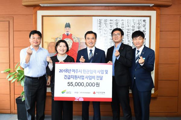 경기 사랑의열매가 최근 여주시에 민관 협력 및 긴급지원 사업비로 5500만원을 전달했다. 사진은 전달식에 참석한 이항진 시장(가운데)를 비롯한 시청 및 사랑의 열매 관계자들이 기탁증을 들고 기념촬영을 하는 모습. (사진제공=여주시청)