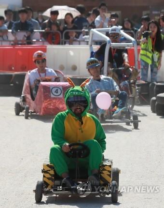 30일 서울 마포구 문화비축기지에서 열린 '서울 2018 메이커페어' 행사에서 DIY 전동카트 레이싱 대회 참가자들이 각양각색의 카트를 타고 레이싱 대결을 펼치고 있다.