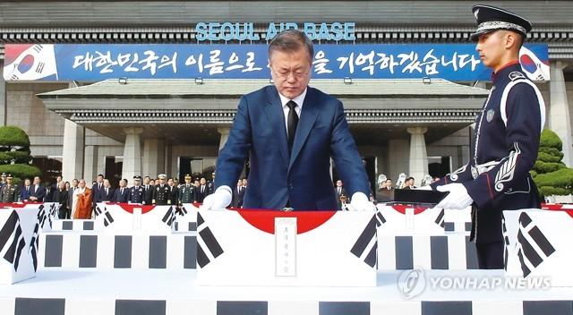문재인 대통령이 국군의 날인 1일 오전 서울공항에서 열린 국군 유해 봉환행사에서 68년 만에 돌아온 국군 유해 64위에 6.25 참전 기장을 수여한 뒤 유해함을 어루만지고 있다.