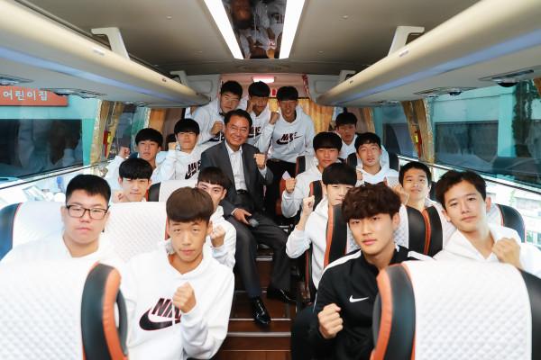 광진구는 지난 9월29~30일 양일간 잠실실내체육관 및 종목별 대회장소에서 열린 2018 서울시민체육대축전에서 종합 3위를 차지했다. 사진은 서울시민체육대축전에서 종합우승을 차지한 풋살팀이 대회 시작 전 김선갑 구청장과 함께 파이팅하는 모습. (사진제공=광진구청)