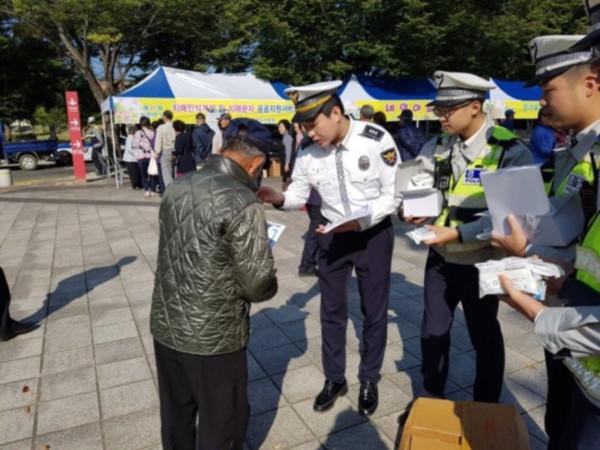경기 연천경찰서가 2일 수레울아트홀에서 열린 ‘노인의 날’ 행사에 참가해 일반도로 전좌석 안전띠 착용 등과 관련한 내용으로 ‘도로교통법 일부개정안 홍보’를 진행했다. 사진은 경찰관이 지역주민을 대상으로 캠페인을 진행하는 모습. (사진제공=연천경찰서)