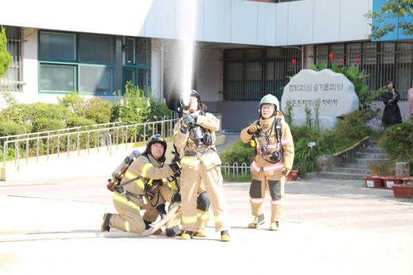 서울 영등포소방서는 1일 오전 서울영동초등학교 학생과 교직원을 대상으로 ‘공공기관 합동 소방훈련’을 실시했다. 사진은 소방관들이 학생들을 대상으로 소화전을 이용해 화재를 진압하는 모습을 시연하고 있는 모습. (사진제공=영등포소방서)