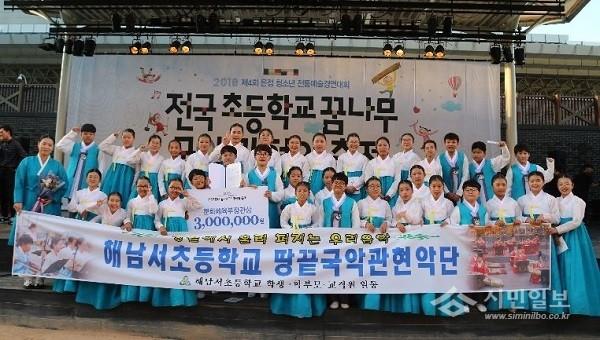 | ▲ 전국초등학교꿈나무 국악관현악 축제에서 문화체육부 장관이 시상하는 대상을 수상한 해남서초등학교‘땅끝’국악관현악단(사진) | ||