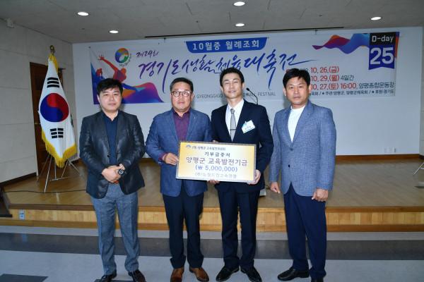 경기 양평군 육계지부와 (주)뉴월드컵고속관광은 군의 인재양성 등을 위해 지난 1일 군에 각각 200만원과 500만원의 교육발전기금을 기탁했다. 사진은 기탁식에서 뉴월드컵고속관광 관계자들이 기탁증을 들고 기념촬영을 하는 모습. (사진제공=양평군청)