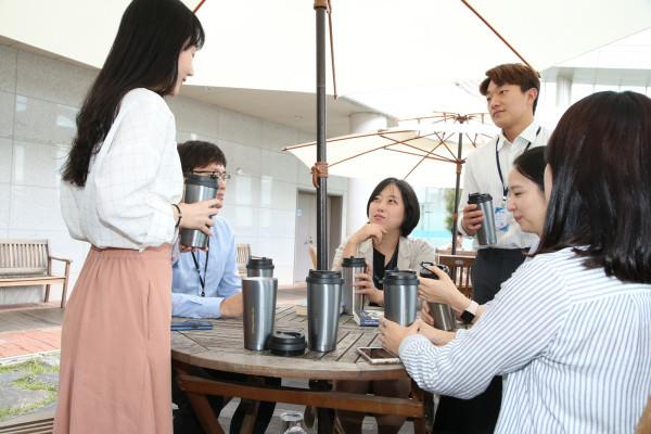 ▲ 서울 마포구 직원들이 텀블러를 사용하고 있다. 구는 일회용품 사용을 줄이기 위해 전직원에게 텀블러를 배부했다. (사진제공=마포구청)