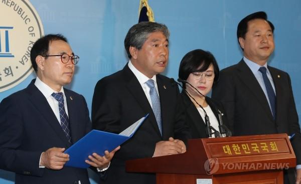 이용범 인천시의회 의장(왼쪽부터), 송한준 경기도의회 의장, 박윤미 강원도의회 부의장이 4일 오전 국회 정론관에서 '4·27 판문점선언 국회 비준동의 촉구 접경지역 3개 광역의회 의장 공동성명서'를 발표하고 있다.
