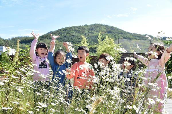 맑은 가을 날씨를 보인 4일 낮 서울 서대문구청 견학에 나선 서대문구립우정어린이집 원아들이 구청 옥상정원에서 구절초를 관찰하며 즐거운 시간을 보내고 있다. 뒤편으로는 ‘순환형 무장애 자락길’로 유명한 서대문구 안산(鞍山)이 바라보이고 있다. (사진제공=서대문구청)