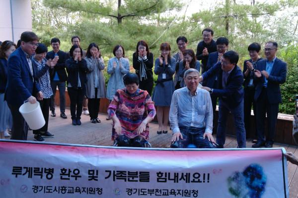 경기 부천교육지원청 맹성호 교육장(오른쪽)은 5일 시흥교육지원청 현관 앞에서 루게릭병 환우들을 위한 ‘아이스버킷 챌린지’에 동참했다. 이번 챌린지는 안산회복지원단장의 지목으로 성사돼 시흥교육지원청 조은옥 교육장과 함께 진행했다. (사진제공=부천교육지원청)