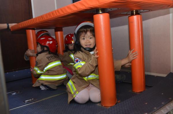 서울 종로소방서는 4일 종로구 신문로에 위치한 경찰박물관 및 경희궁 앞 공터에서 유치원 아동 150여명을 대상으로 이동안전체험 차량 소방안전 교육을 실시했다. 사진이 어린이들이 진도 규모에 따른 지진체험을 하고 있는 모습. (사진제공=종로소방서)