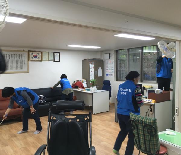 경기 수원시 영통구 영통1동은 최근 삼성에스원NC봉사단과 지역사회보장협의체가 참여해 쌍용아파트경로당과 청명주공4단지경로당 2곳 경로당에 대해 ‘청년들과 함께하는 소박한 다솜나눔(청·소 다솜나눔)’사업을 실시했다. 사진은 참여자들이 청소를 하고 있는 모습. (사진제공=영통구청)