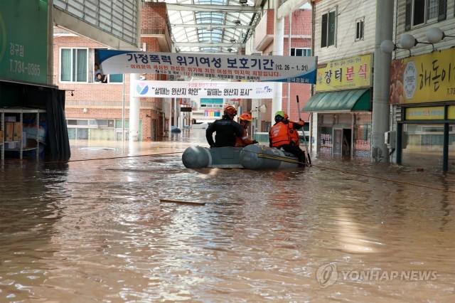 지난 6일 태풍 '콩레이' 영향으로 많은 비가 내린 경북 영덕군 강구면 강구시장에서 구조대가 보트를 타고 다니며 주민을 구조하고 있다.