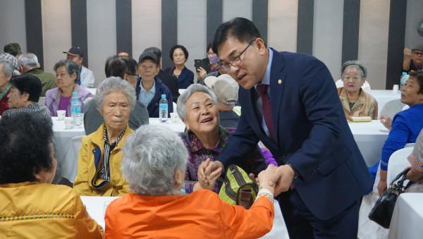 최근 서울 강동종합사회복지관에서 개최된 2018년 사랑과 나눔의 효도잔치 ‘흥따라 행복따라 노년의행진’에 참석한 제갑섭 부의장이 노인들의 건강과 안녕을 기원했다. 사진은 참여 노인들과 인사를 나누고 있는 제 부의장의 모습. (사진제공=강동구의회)