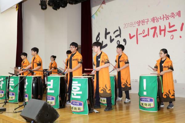 지난 6일 서울 양천구가 구청 3층 양천홀에서 ‘안녕, 나의 재능’이라는 주제로 '2018년 양천구 재능나눔축제'를 개최했다. 이번 축제에서는 재능나눔 부스, 재능나눔 아카데미, 재능나눔 공연 등 다양한 프로그램이 진행됐다. 사진은 재능나눔축제에서 펼펴진 난타 공연 모습. (사진제공=양천구청)