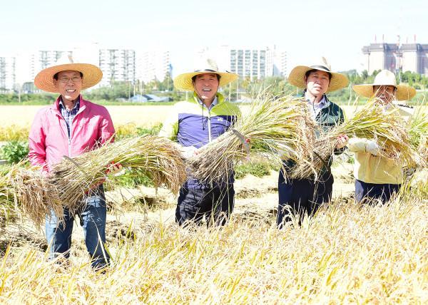 경기 안산시는 본격적인 벼 수확기를 맞아 지난 4일 상록구 본오동 소재의 논에서 벼 베기 시연회를 가졌다. 이날 시연회에 참석한 윤화섭 시장은 농업인들과 함께 직접 콤바인으로 벼 베기 작업을 진행했다. 사진은 윤 시장(왼쪽에서 두 번째)이 참여자들과 함께 벼를 들고 기념촬영을 하는 모습. (사진제공=안산시청)