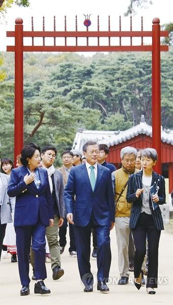 문재인 대통령과 부인 김정숙 여사가 한글날인 9일 오후 경기도 여주 세종대왕 유적지를 방문, 효종 영릉을 참배한 뒤 세종대왕 영릉을 참배하기 위해 ‘왕의 숲길’로 향하고 있다.
