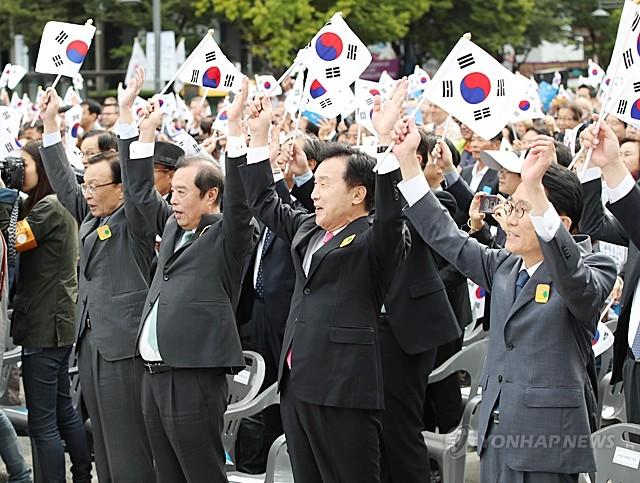 9일 서울 종로구 광화문 광장 세종대왕 동상 앞에서 열린 제527돌 한글날 경축식에 더불어민주당 이해찬 대표(왼쪽부터), 자유한국당 김병준 비상대책위원장, 바른미래당 손학규 대표, 정의당 윤소하 원내대표가 태극기를 들고 만세삼창을 하고 있다.