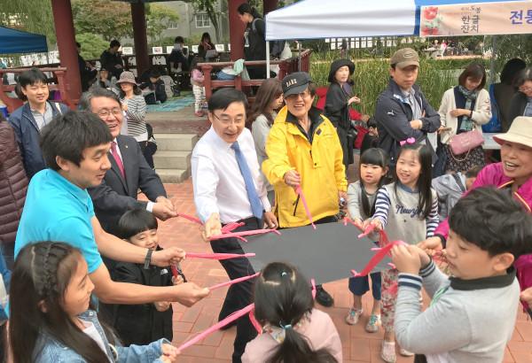 이동진 서울 도봉구청장은 9일 방학동 원당샘공원 일원에서 열린 ‘제7회 정의공주와 함께하는 도봉한글잔치’에 참석했다. 사진은 행사에 참석한 이 구청장과 아동들이 프로그램에 참여하고 있는 모습. (사진제공=도봉구청)