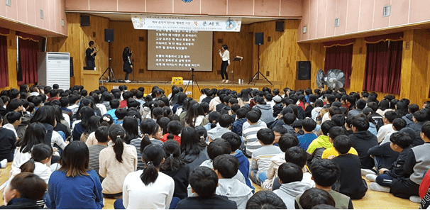 용인교육지원청의 독서문화프로그램의 지원을 받아 진행된 이번 행사에는 북뮤지션 제갈인철, 뮤지컬배우 이지은이 출연해 5권의 책을 주제로 5,6학년 320여명과 약 2시간동안 책 노래, 낭독, 북 퀴즈 등의 다양한 형식의 내용으로 진행됐다.