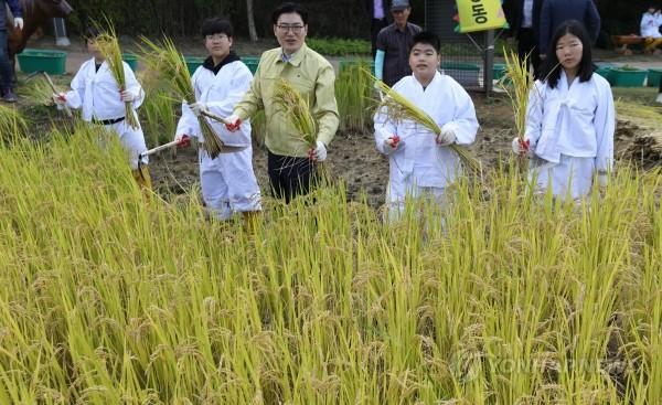 이정훈 강동구청장, 학생들과 벼베기 체험