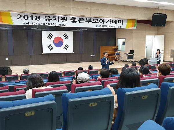 경기도김포교육지원청은 오는 11월7일까지 청내 아라홀에서 지역내 공·사립유치원 학부모 100여명을 대상으로 ‘2018 유치원 좋은부모 아카데미’를 진행한다. 사진은 10일 김정덕 교육장이 학부모들에게 인사말을 하는 모습. (사진제공=김포교육지원청)