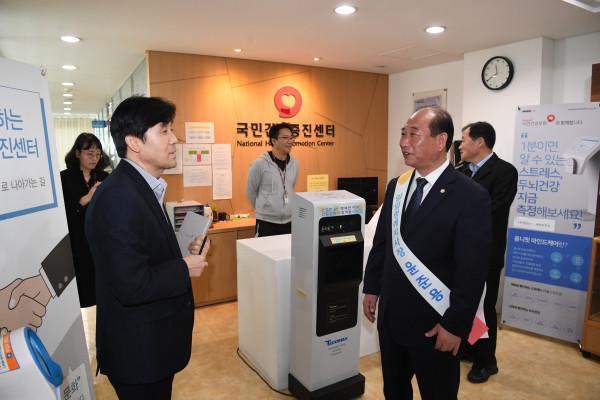 윤준용 서울 영등포구의장은 11일 국민건강보험공단 영등포남부지사 일일명예지사장으로 임명돼 지역주민과 소통하는 시간을 보냈다. 사진은 윤 의장(오른쪽)이 지역주민들과 이야기를 나누는 모습. (사진제공=영등포구의회)