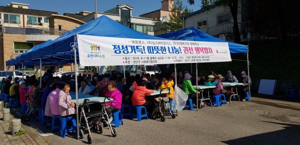 경기 수원시 권선구는 12일 (주)포콘스의 후원으로 구운동 행정복지센터에서 ‘참! 맛있는 행복밥차’를 운영했다. 사진은 행사에 참여한 노인들이 식사를 하기 위해 앉아 있는 모습. (사진제공=권선구청)