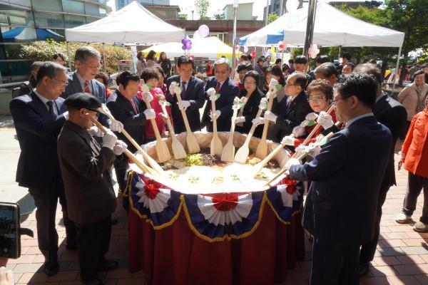 11일 유덕열 서울 동대문구청장이 동대문노인종합복지관 3층 강당에서 진행된 ‘동대문노인종합복지관 개관 15주년 기념식’에 참석했다. 사진은 유 구청장이 관계자들과 함께 대용량 비빔밥 만들기를 하고 있는 모습. (사진제공=동대문구청)