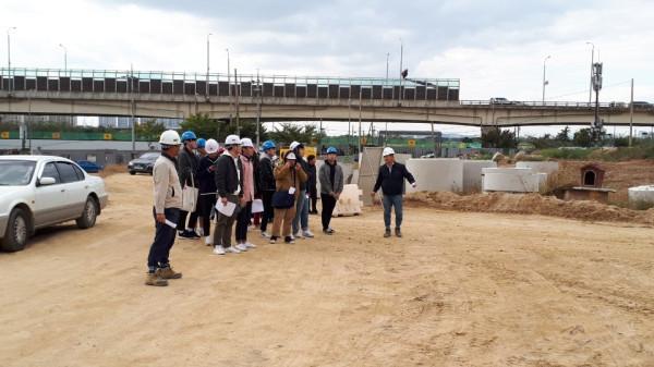 인천 연수구는 최근 인천대학교 학생들을 대상으로 ‘도시분야 인재양성을 위한 도시학교(현장견학)’를 진행했다. 사진은 인천대학교 도시행정학과 학생 20여명이 도시개발 사업이 진행 중인 공동주택 및 단독주택부지 현장에서 도시개발사업에 대한 흐름과 기반시설 공사현황 등에 대한 설명을 듣고 있는 모습. (사진제공=연수구청)
