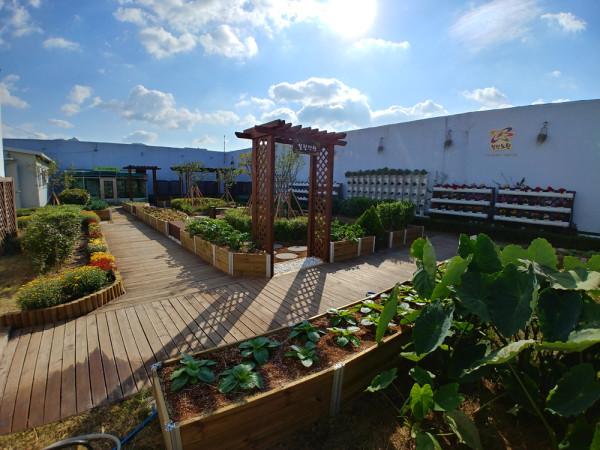 힐링정원은 30m 모듈형 텃밭과 조경수, 디딤석 35개, 벤치 5개 등으로 꾸며졌다. 외부는 직선의 美, 내부는 곡선의 미(美)를 살려서 즐거움과 편안함이 있는 휴식 공간으로 조성했다.