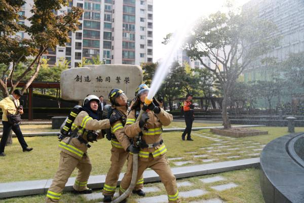 서울 영등포소방서는 15일 오후 영등포구 여의도동에 위치한 전국경제인연합회 건물에서 초기 화재대응능력 배양과 긴급상황 발생에 대비한 민·관 합동 소방훈련을 실시했다. 사진은 소방관들이 화재진압 훈련을 하고 있는 모습. (사진제공=영등포소방서)