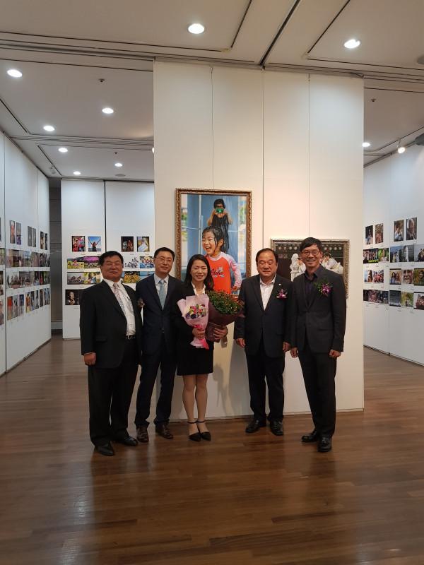15일 광진구 자양동 소재 나루아트센터에서 ‘제20회 전국 아름다운 미소 사진전’ 개막식이 열렸다. 사진은 시상식 후 박대우 부구청장(맨 오른쪽) 및 금상 수상자 김숙영씨(가운데), 고양석 구의장(오른쪽 두 번째) 등이 함께 김씨 작품 ‘해맑은미소’ 앞에서 기념촬영을 하는 모습. (사진제공=광진구청)
