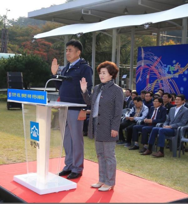 김동희 경기 부천시의회 의장은 15일 오후 3시 부천종합운동장 궁도장에서 열린 부천시선수단 결단식에 참석했다. 사진은 김 의장(오른쪽)이 부천시체육회 수석 부회장과 선서를 하고 있는 모습. (사진제공=부천시의회)