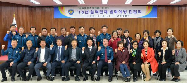 경기 광명경찰서는 최근 경찰서 4층 어울마당에서 民ㆍ警 협력치안 활성화를 위해 자율방범대 및 어머니자율방범대 등 40여명이 참석한 가운데 2018년도 협력단체 방범간담회를 실시했다. 사진은 간담회 참여자들이 기념촬영을 하는 모습. (사진제공=광명경찰서)