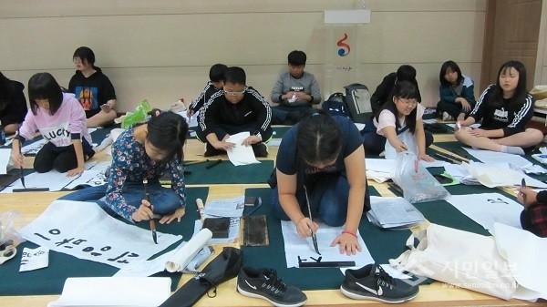 | ▲ 고산문학축전 서예부문에 참가한 해남동초교 학생들(사진) | ||