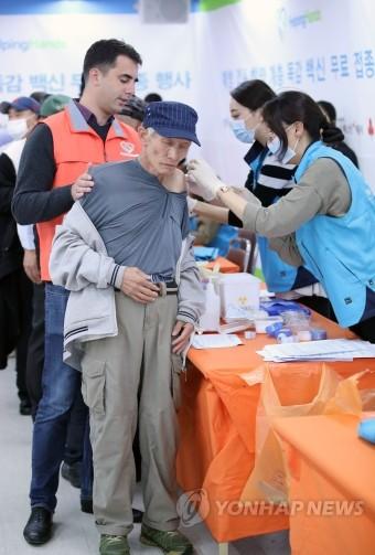 16일 서울역 인근 노숙인 무료 급식소인 '따스한 채움터'에서 나눔진료봉사단 의료진이 노숙인과 쪽방촌 주민에게 무료로 독감 예방접종을 해주고 있다.
