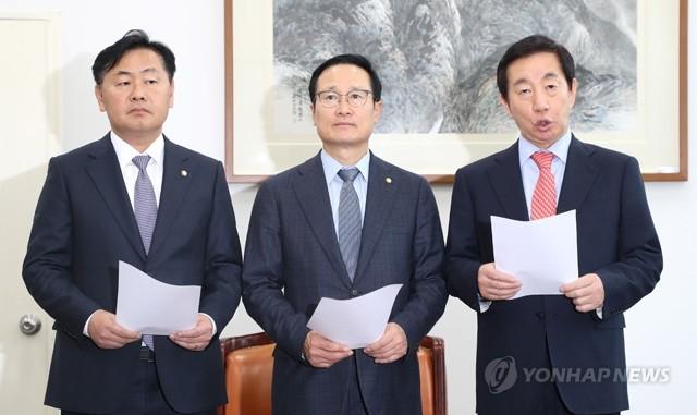 바른미래당 김관영(왼쪽부터), 더불어민주당 홍영표, 자유한국당 김성태 원내대표가 16일 오후 국회 운영위원장실에서 비상설특별위원회 구성에 합의한 뒤 발표하고 있다.