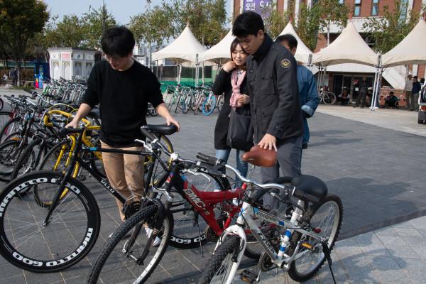 서울 광진구는 16일 광진광장에서 재생자전거를 기증하는 ‘2018년 자전거에 사랑을 싣고’ 행사를 개최했다. 이번 행사는 방치 자전거를 수거·정비해 재생산한 자전거를 저소득층과 공공기관에 지원함으로써 자전거이용을 활성화하고 이웃사랑 나눔문화 확산에 기여하기 위해 마련됐다. 사진은 자전거 상태를 점검하고 있는 동주민센터 직원의 모습. (사진제공=광진구청)