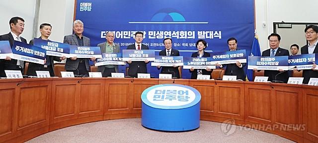 더불어민주당 이해찬 대표가 17일 오전 국회에서 열린 ‘민생연석회의’ 출범식에서 불공정 카드수수료 개선·건설노동자노후보장·하도급납품대금조정·주택임대차보호강화·편의점주최저수익보장 등의 5대 과제 추진 방향이 적힌 손팻말을 들고 참석자들과 기념촬영을 하고 있다.