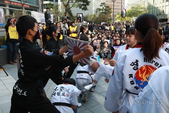 한국정신대문제대책협의회(정대협) 주최로 17일 오후 서울 중학동 주한일본대사관 앞 소녀상에서 열린 제1357차 일본군 위안부 문제해결을 위한 수요시위에서 고읍 영웅 태권도 학생들이 공연을 펼치며 일본 욱일기가 부착된 송판을 격파하고 있다.