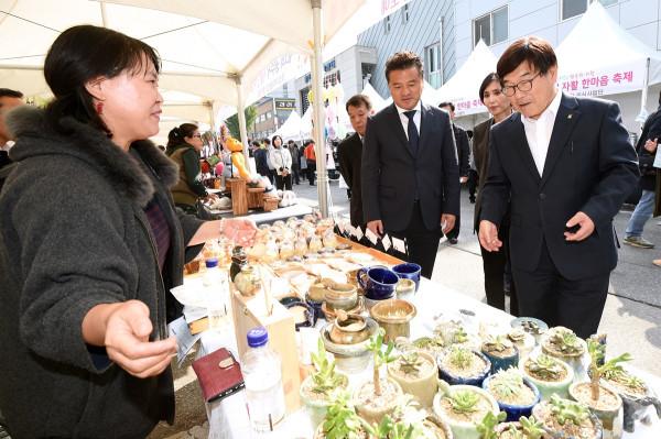 17일 경기광주지역자활센터가 시청 주차장에서 ‘오늘보다 내일이 행복한 자활’이라는 주제로 ‘제3회 자활 한마음 축제’를 개최했다. 사진은 자활기업에서 생산된 물건들이 진열된 한 상점에서 물건을 구경하고 있는 관계자들의 모습. (사진제공=광주시청)
