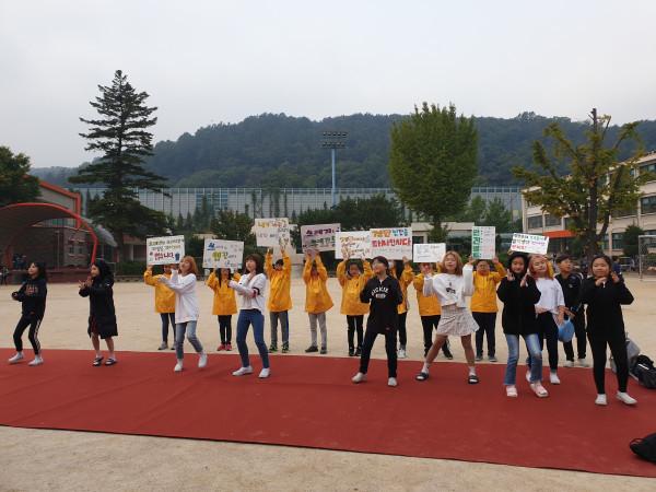 경기 이천시에 위치한 마장초등학교는 경기도이천교육지원청이 주관한 ‘2018 학생자치 예술 꿈마당’ 운영 학교로 선정돼 최근 3일에 걸쳐 학생 자치회와 교내 댄스동아리가 함께 하는 '환경·안전 캠페인'을 실시했다. 사진은 참여자들이 캠페인을 진행하는 모습. (사진제공=이천교육지원청)